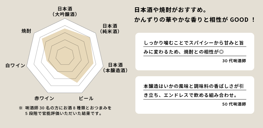 貝ひもならではの噛むほどに広がる味わいと、かんずりのまろやかな唐辛子の旨みと爽やかな柚子の香りが楽しめます。
