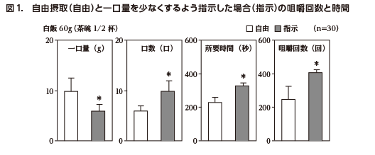 図1は、白飯60g(茶碗1/2杯)を一口量を自由摂取(自由)にした場合と、一口量を少なくするように指示した場合(指示)の咀嚼回数と咀嚼時間です。 同じ量の白飯を食べているのですが、咀嚼時間、咀嚼回数ともに「一口量を少なくするよう指示した場合」の方が多くなっていることが分かります。